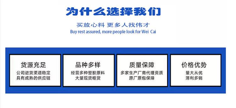 東莞市偉才塑膠原料有限公司是集塑膠原料銷售、技術服務于一體的綜合性企業。公司秉著"信譽為先,質量為上,敬畏客戶每一分錢"的宗旨開展經營活動。偉才塑膠原料公司銷售類別有工程塑膠原料、特種工程塑膠原料、合金塑料、可降解塑料、熱塑彈性體塑料及通用塑膠原料,主營PA工程塑料,POM塑料,PC塑料,PC/ABS塑料,TPU塑料,ABS塑料,LCP塑料,PLA可降解塑料,PBAT可降解塑料,特種工程塑料PA6T、PA9T塑料、PA46塑料、EVA塑料等原料。